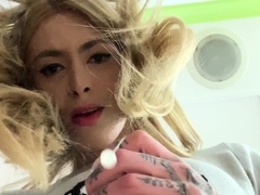Short haired Blonde trans jerking her hard cock